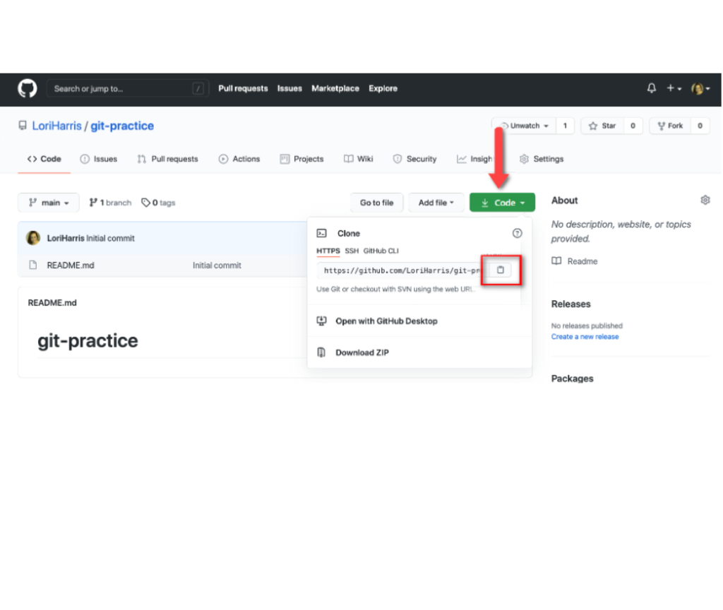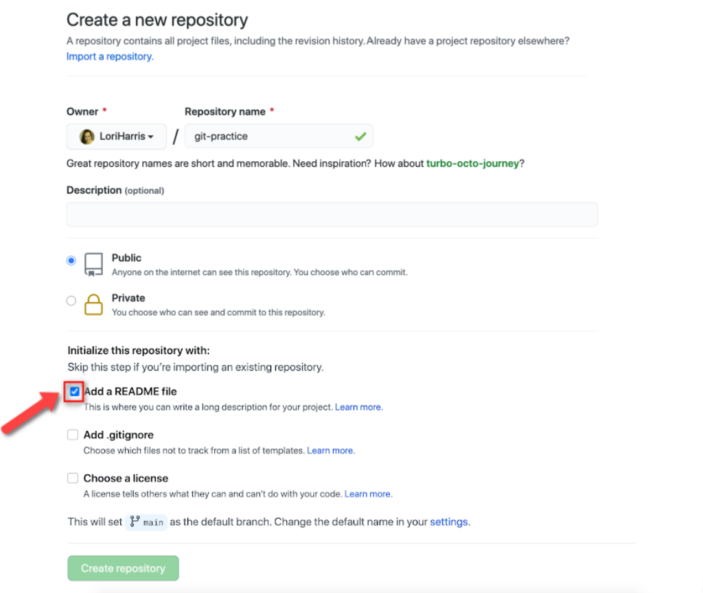 Create a new project named git-practice. Add a short description to the project, such as “practicing with git.” Then, initialize the repository with a README and create the repository.