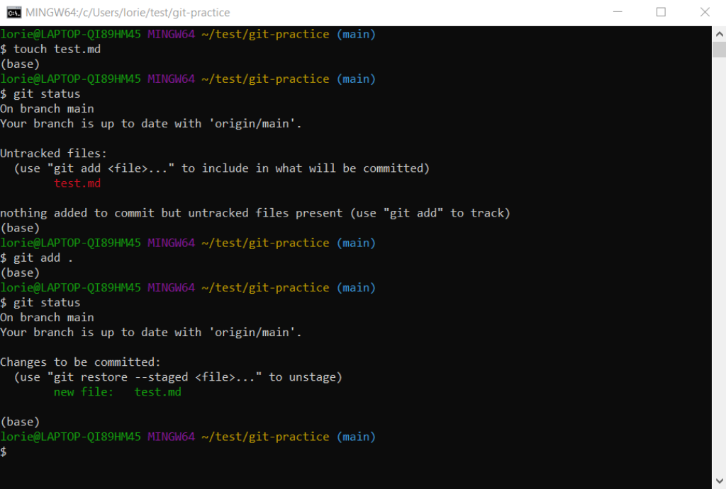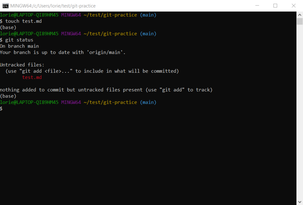 Create a new file named test.md and then check your git status again. Notice that git is now showing you have an untracked file.