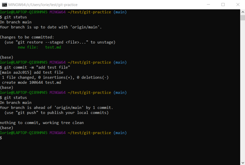 Commit the changes to the repository along with a commit message using the git commit -m "add test file" command. This creates a new commit with the “add test file” commit message.