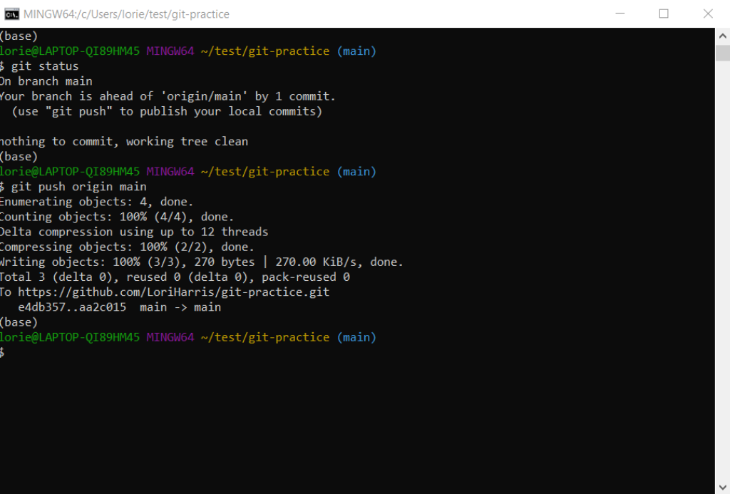Push the changes to GitHub to sync your machine with GitHub. Use the git push origin main command.