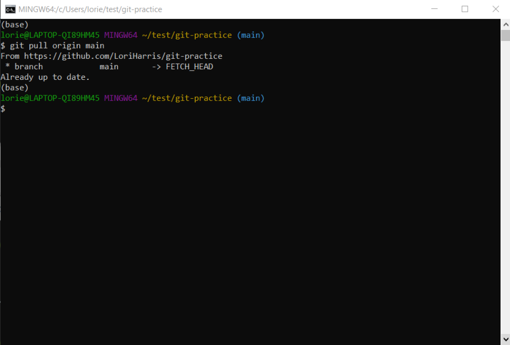 If you made changes to the repository on another computer, you can pull down the changes you’ve committed with the git pull origin main command. But since you haven’t made any changes yet, git will tell you that you’re already up to date.