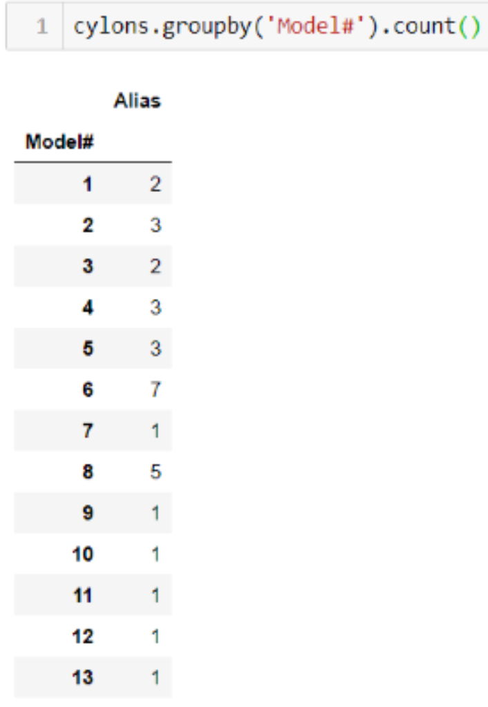 The groupby function puts all elements of a certain category together by finding each unique value in the column specified and converting that to a new index. If you were to group our cylons_df by the Model# but not apply a function to it, the code can run the grouping, but it doesn’t know what to do with the other columns. There would be a new index, with extraneous data that doesn’t fit the new index length or match up in anyway. By applying an aggregation function, such as .count(), the code can perform an aggregation on the other columns and keep them in the object.